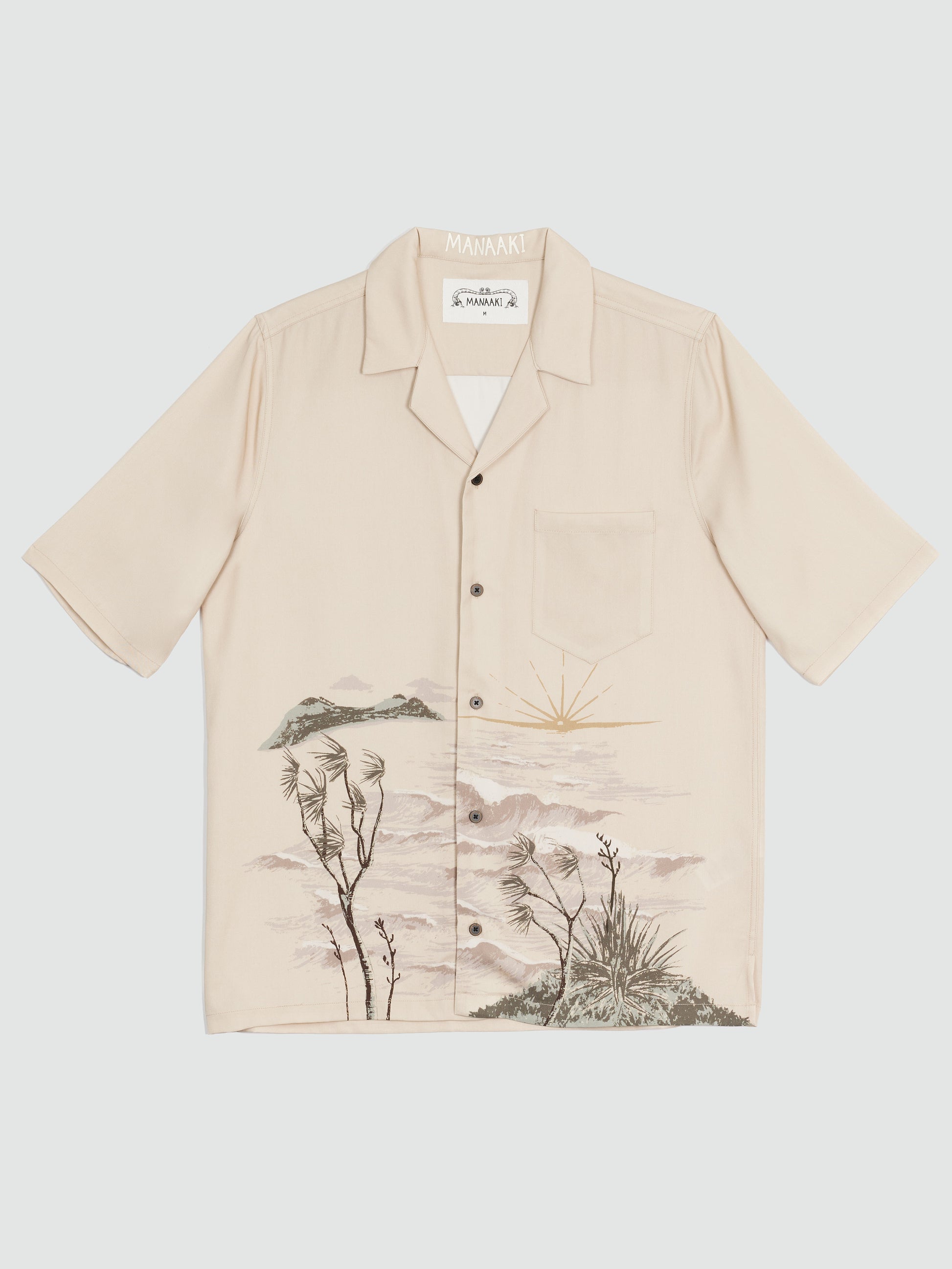 Featuring original artwork hand-painted by MANAAKI designer Kat Tua, the Stormy Waters Shirt depicts the wild coastlines of Aotearoa and the turbulent waters of our present political landscape for Māori. A rising sun breaks through the horizon — a reminder to hold faith and remain steadfast in the hope of a new day ahead.