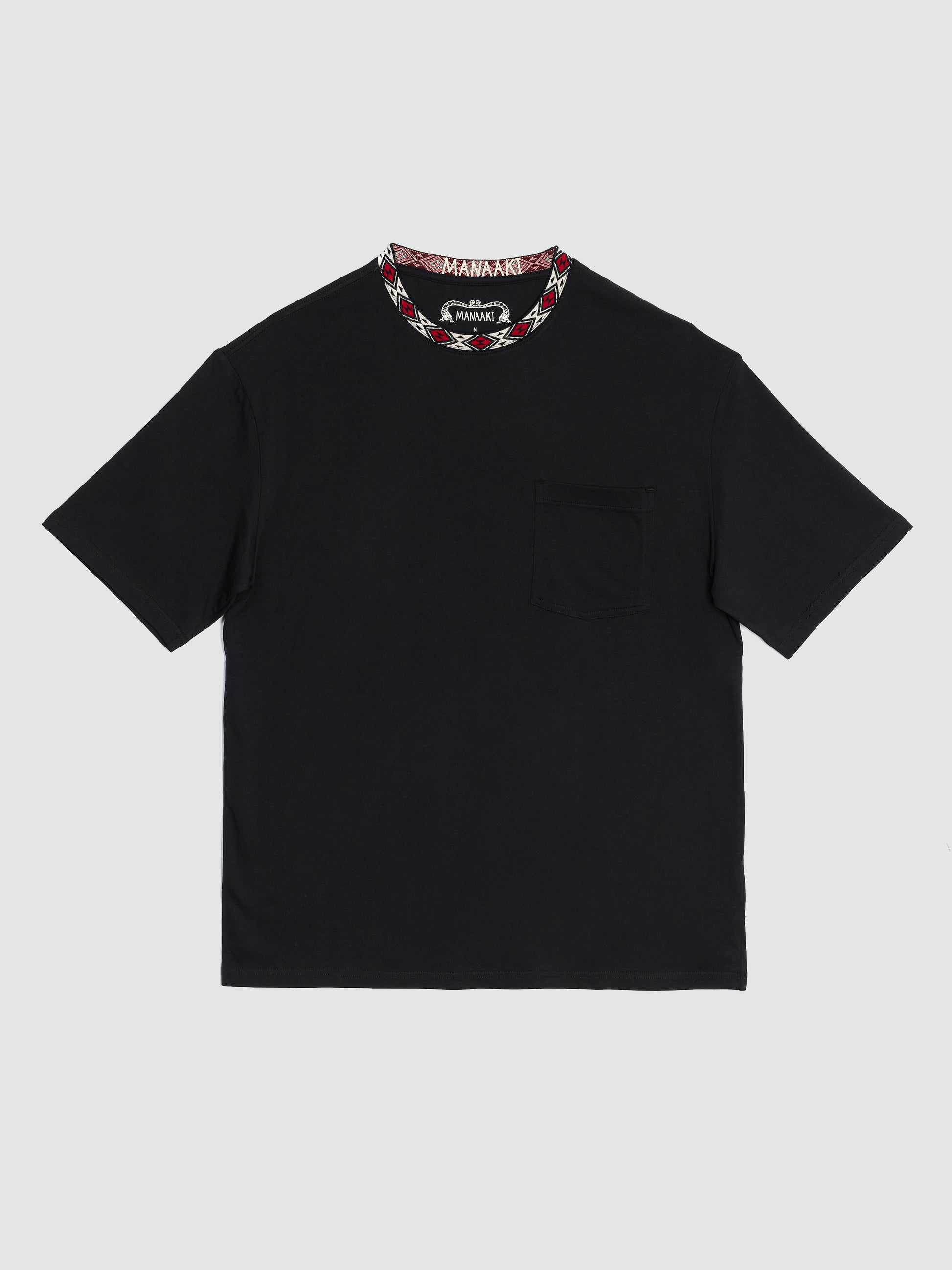 Infused with Māori elements, the ‘Tu Meke’ (or ‘too much’) tee refers to the oversized fit; while the jacquard knitted neck band depicts Tāniko designs, traditional to Māori culture. Made from organic cotton.